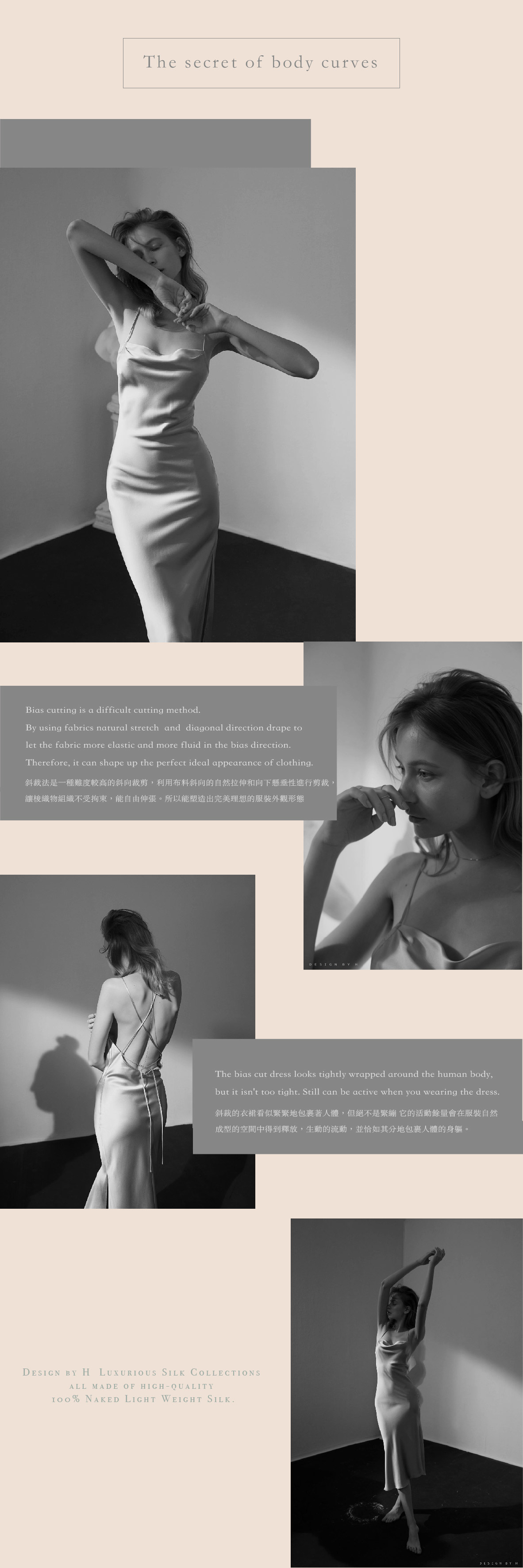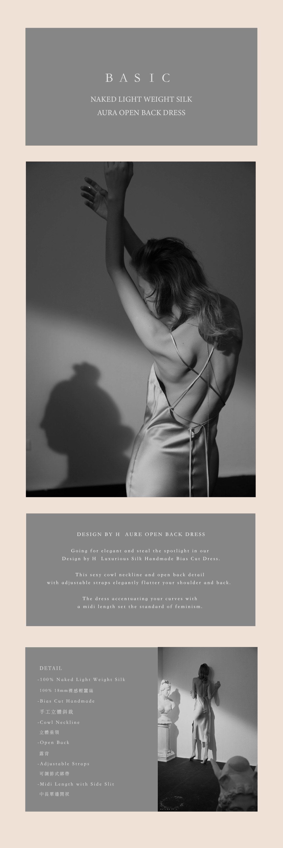 以女性優雅的曲線為靈感,AURA DRESS 採用 立體斜裁(bias cut),讓布料自然順著身形垂落,呈現柔滑的光澤與完美比例。前幅的 垂領設計 輕柔勾勒鎖骨,背部的 極簡開背線條 則展現恰到好處的性感與自信。