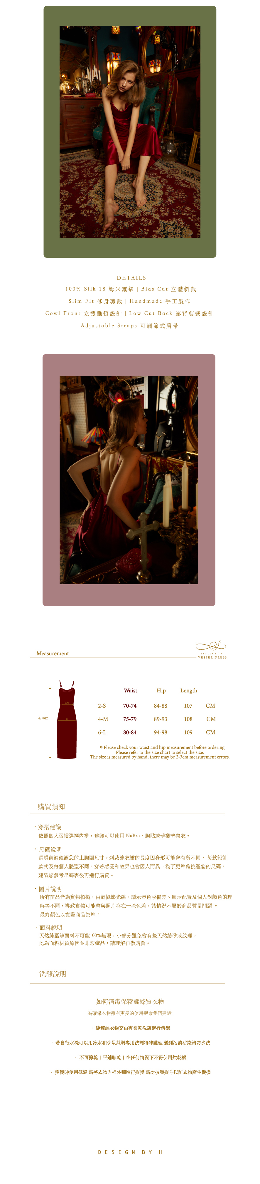 此款洋裝採用露背與垂領設計,建議依照臀圍尺寸選擇,以確保下擺與整體剪裁的流暢貼合度,同時兼顧穿著時的舒適性與美觀度。