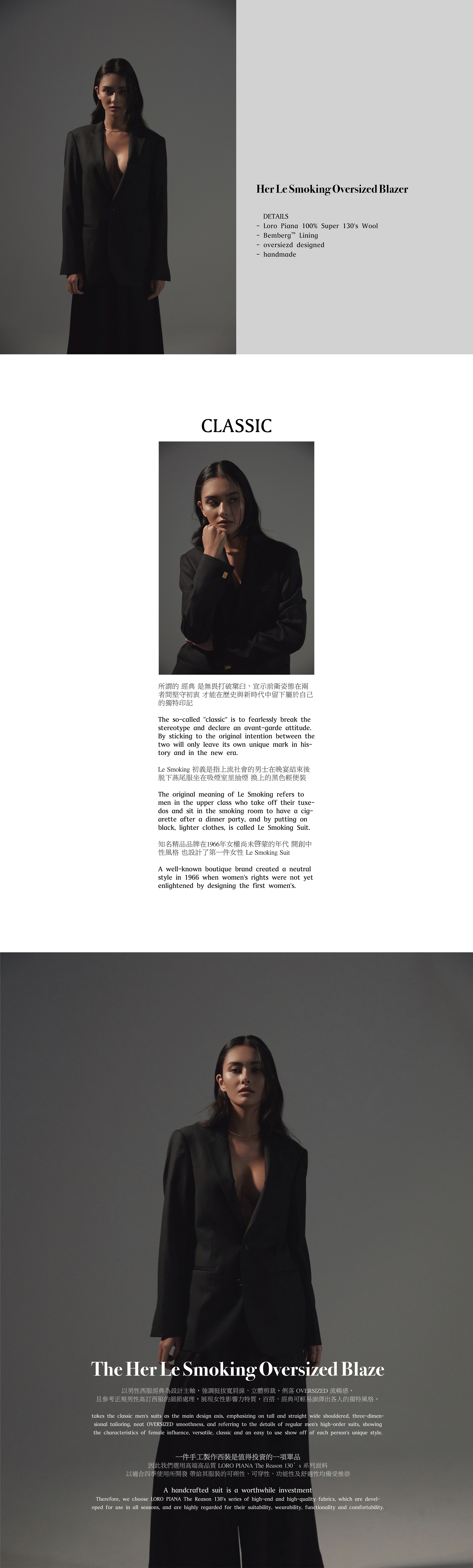 以男性西服經典 Le Smoking 為設計主軸,強調挺拔寬肩線、立體剪裁,俐落 OVERSIZED 流暢感,且參考正規男性高訂西服的細節處理,展現女性影響力特質,百搭、經典可輕易演繹出各人的獨特風格。