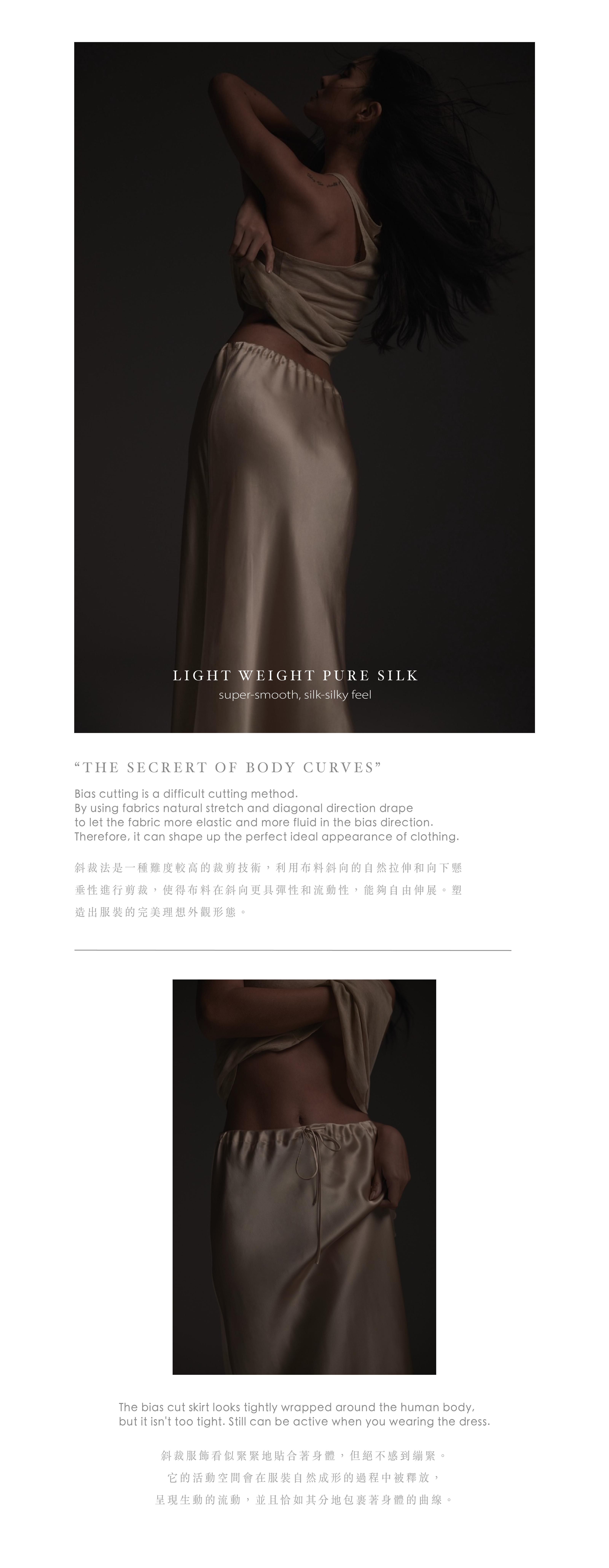 精緻優雅,專屬於妳的絲滑體驗 抽繩魚尾長裙採用100%純蠶絲製成,觸感宛如第二層肌膚,讓您在穿著時感受無與倫比的柔滑與輕盈。裙身設計融入細緻的抽繩細節,可自由調整鬆緊,完美貼合不同身形,為每位女性量身打造專屬的優雅線條。
