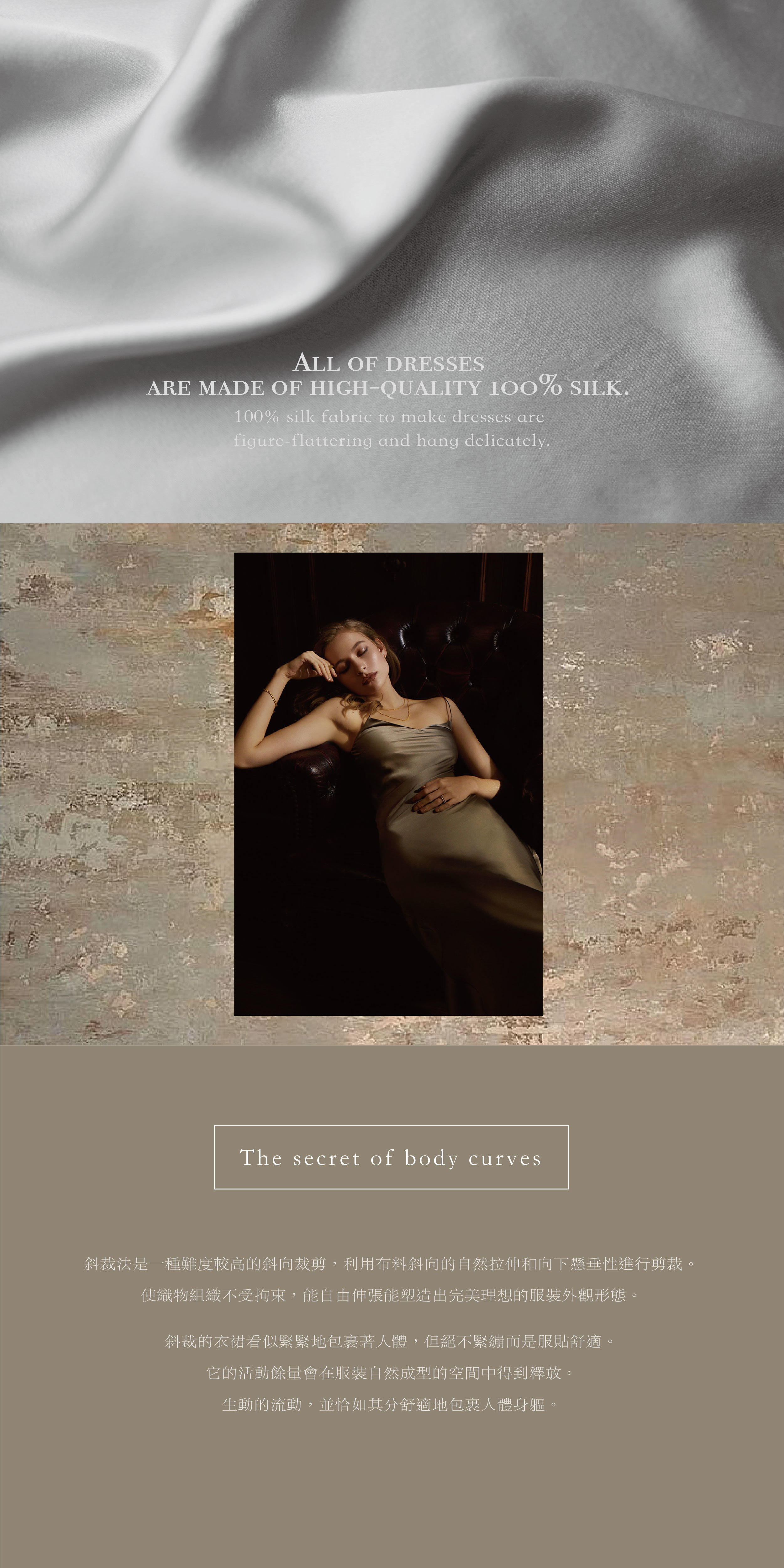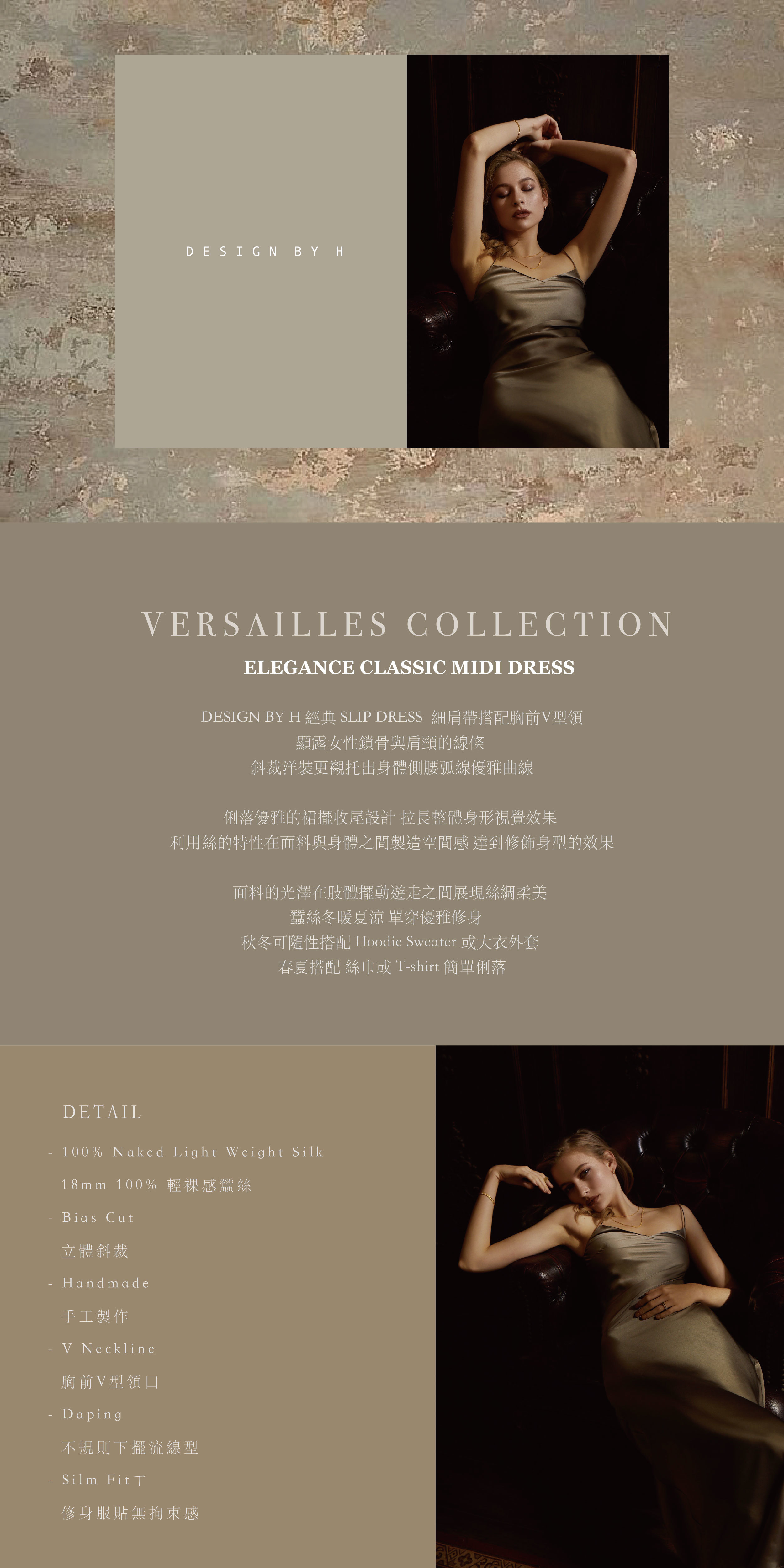 VERSAILLES Classic Italian Silk Midi Slip Dress 選用選用義大利蠶絲100%天然蠶絲手工製作,面料輕盈透氣,觸感絲滑如水,為肌膚帶來極致的呵護。每件裙子都由經驗豐富的工匠精心製作,通過數道手工工序,力求每一個細節都達到完美。蠶絲不僅光澤柔美,還具有天然的體溫調節和抗過敏特性,適合不同膚質及四季穿著。無論是作為打底裙,還是單獨穿著,它都能完美地展現出您的優雅魅力。